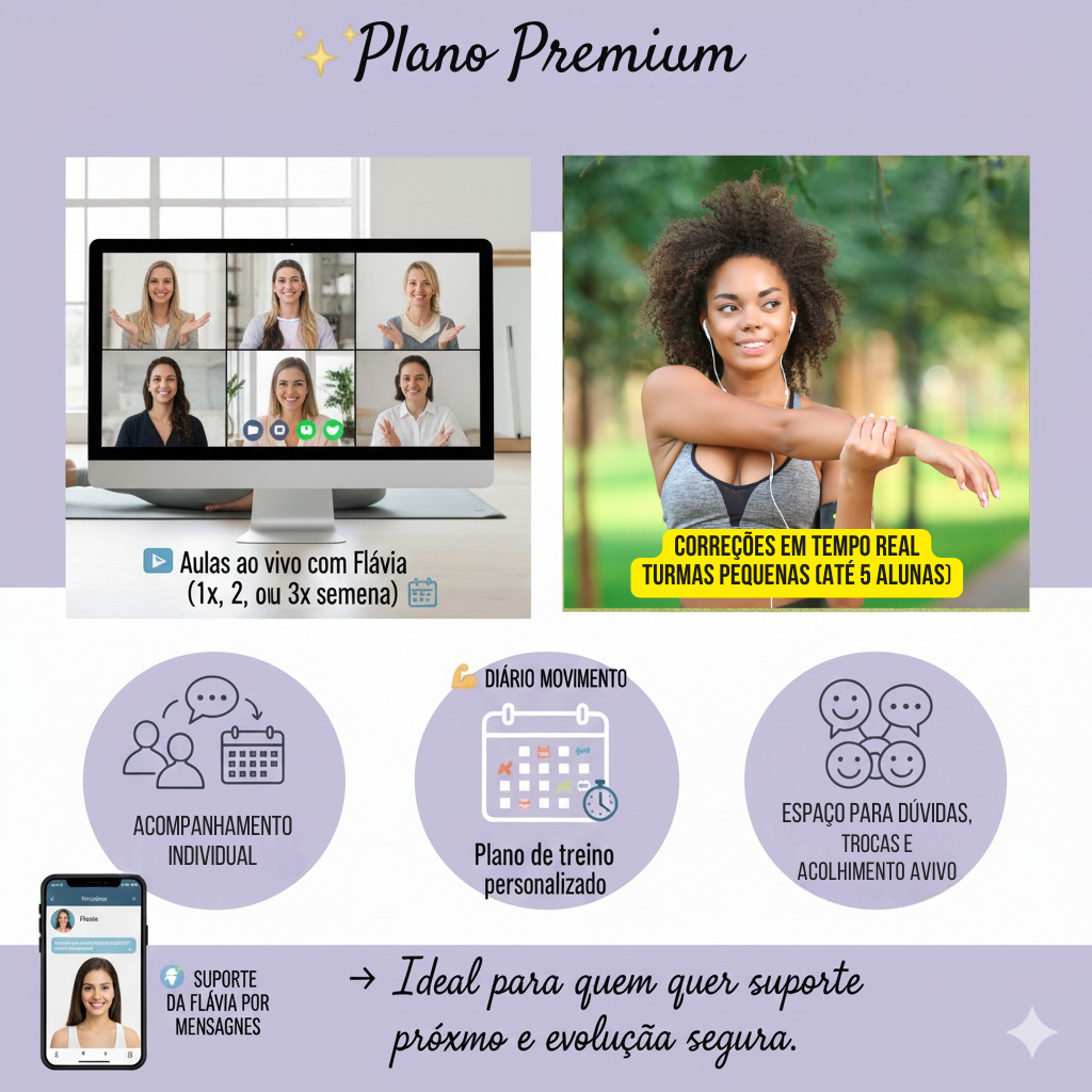 📹 Aulas ao vivo com Flávia (1x, 2x ou 3x por semana)